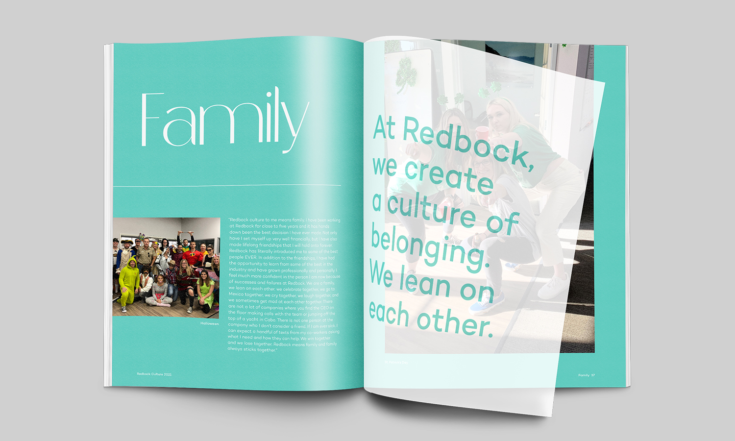 Redbock, a recruiting agency for the life sciences, was in need of a way to highlight the amazing culture that they have built over the years. The foundation of their culture was transparency, honesty, and collaboration. A custom gradient was designed to showcase collaboration and unity. Introducing transparent sheets throughout the manual spoke to the transparency while the bold and bright layouts spoke to the type of environment they have created. One that is full of fun.